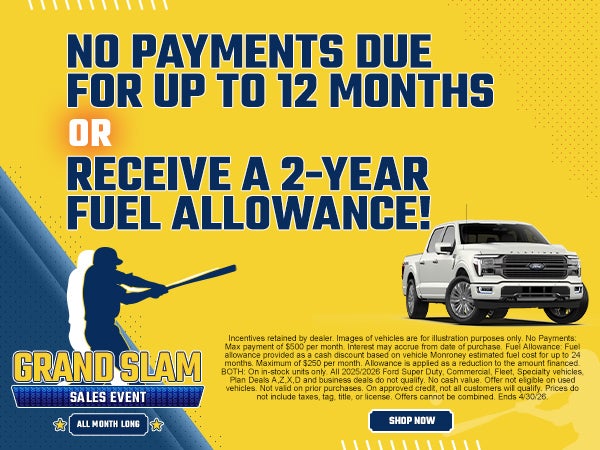Incentives retained by dealer. Images of vehicles are for illustration purposes only. No Payments: Max payment of $500 per month. Interest may accrue from date of purchase. Fuel Allowance: Fuel allowance provided as a cash discount based on vehicle Monroney estimated fuel cost for up to 24 months. Maximum of $250 per month. Allowance is applied as a reduction to the amount financed. BOTH: On in-stock units only. All 2025/2026 Ford Super Duty, Commercial, Fleet, Specialty vehicles, Plan Deals A,Z,X,D and business deals do not qualify. No cash value. Offer not eligible on used vehicles. Not valid on prior purchases. On approved credit, not all customers will qualify. Prices do not include taxes, tag, title, or license. Offers cannot be combined. Ends 4/30/26.