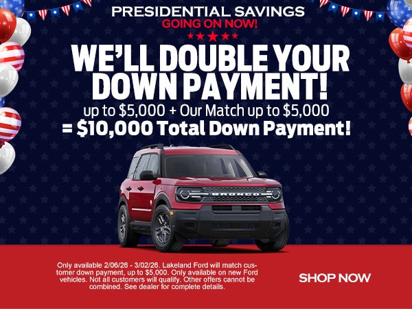 All new Lakeland Ford VEHICLE PRICING includes a Nationwide Lifetime Warranty with Unlimited Miles for an Unlimited Time at no additional cost plus two (2) years factory scheduled maintenance*. All prices are after all factory rebates and do not include taxes, tag, title, license, $998 dealer fee and $395 electronic filing fee. Additional charges may include dealer installed options or equipment (see Addendum Window Sticker and verify details with Lakeland Ford). All factory rebates and incentives assigned to dealer including owner loyalty, military, college graduate, competitive and special incentives that may require financing through Ford Motor Credit (FMC). Offers cannot be combined. All vehicles subject to prior sale. All prices are for retail guests only - no dealers or locators please. All offers are mutually exclusive, see dealer for complete details. Actual MPG rating will vary with options, driving conditions, habits and vehicle condition. This site, and all information and materials appearing on it, are presented to the user "as is" without warranty of any kind, either express or implied. The dealer is not liable for data, information, content or images (including photos and graphics), that may be listed incorrectly. Please confirm the pricing, features, options and incentives (including all rebates you may or may not qualify) of any vehicle with the dealer to ensure its accuracy.